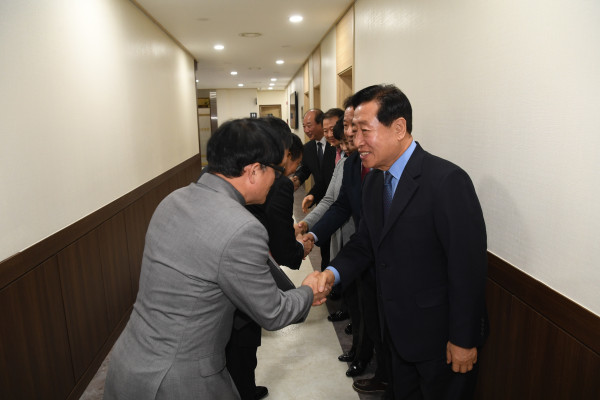 서울 영등포구의회는 2일 2018년 새해에도 구민을 위한 의정활동을 효율적으로 펼칠 수 있도록 의정활동을 보좌하는데 최선을 다하겠다고 다짐하는 ‘2018년 시무식’을 개최했다. 사진은 시무식에 참석한 의원들이 서로 덕담과 인사를 나누는 모습. (사진제공=영등포구의회)