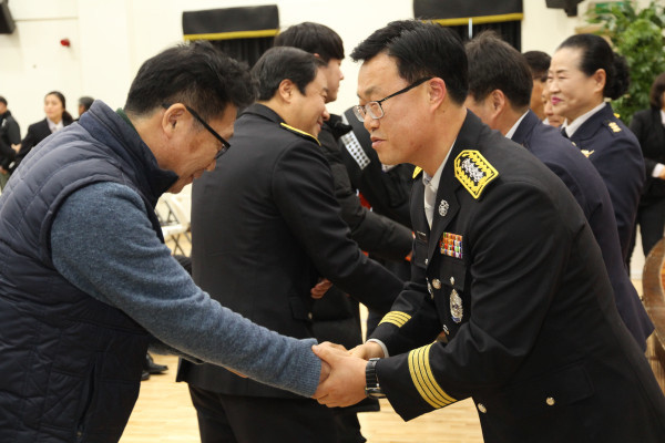 서울관악소방서는 2일 소방서 3층 강당에서 소방서 직원 및 의용소방대원 70여명이 참석한 가운데 제16대 김명호 소방서장 취임식을 가졌다. 사진은 김 서장이 소방서 관계자들과 악수하는 모습. (사진제공=관악소방서)