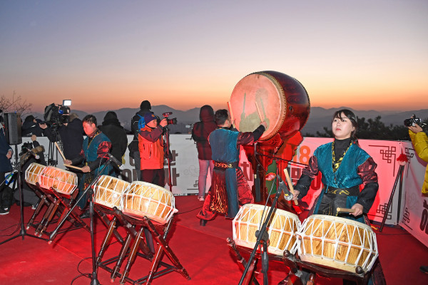 광진구는 지난 1일 오전 7시20분 아차산 해맞이 광장에서 ‘2018 아차산 해맞이 행사’를 개최했다. 사진은 행사에서 식전 타북공연이 진행 중인 모습.