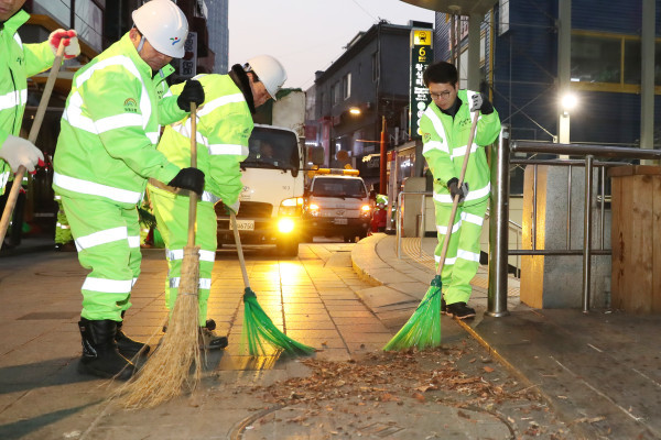 서울 성동구는 2일 2018 무술년 새해 첫 업무를 구청 직원과 환경미화원 등 170여명이 참석한 가운데 지역을 5개권역으로 나눠 주요시설인 학교와 시장, 공원, 전철역 등지에서 대청소를 실시했다. 사진은 거리청소를 하고 있는 관계자들의 모습. (사진제공=성동구청)