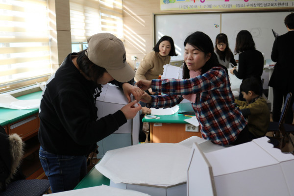 경북 구미교육지원청은 오는 12일까지 구미특수교육지원센터에서 장애학생 학부모 20여명을 대상으로 '겨울방학 학부모 무료 교양강좌'를 운영한다. 사진은 지난 2일 참여자들이 한지공예 실습을 하고 있는 모습. (사진제공=구미교육지원청)