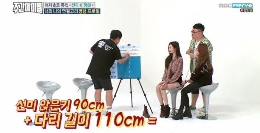 그 결과 선미 다리 길이가 110cm임이 밝혀지며 실제 '롱다리'를 인증했다. '주간아이돌'선미는 몸무게도 공개했다. 45kg이라며, 몸무게 유지 비결에 대해서 활동을 하면 자연스럽게 빠진다고 말했다.