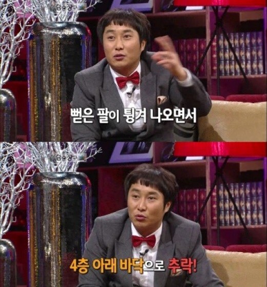 이어 김병만은 "건축설비 일을 할 당시 난간에 앉아 있다가 4층 높이에서 떨어진 일이 있었다. 중간에 팔이 걸려 몸이 돌아가며 옆으로 떨어지지 않았다면 밑에 철근 때문에 진짜 죽었을 것"이라고 말해 안타까움을 자아냈다.