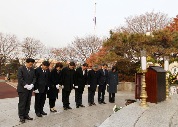 지난 2일 경기 광명시의회 이병주 의장 등 의원들이 광명시 철산동 현충탑을 찾아 참배를 한 후 무술년 새해 업무를 시작했다. 사진 왼쪽부터 김기춘·이영호·이길숙·김익찬·이병주·나상성·안성환·고순희 의원.
