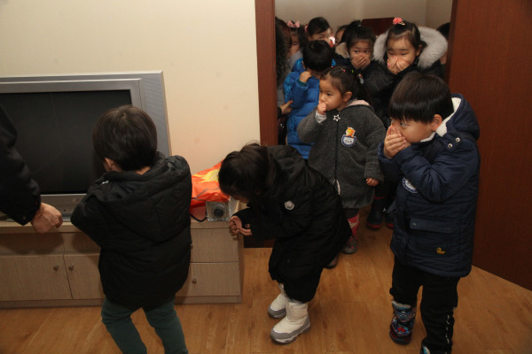서울 관악소방서는 4일 오전 10시 선교어린이집 원생 30여명을 대상으로 어린이 소방안전체험 교육을 실시했다. 사진은 화재가 발생했을 때를 가정해 어린이들이 대피 체험을 하는 모습. (사진제공=관악소방서)