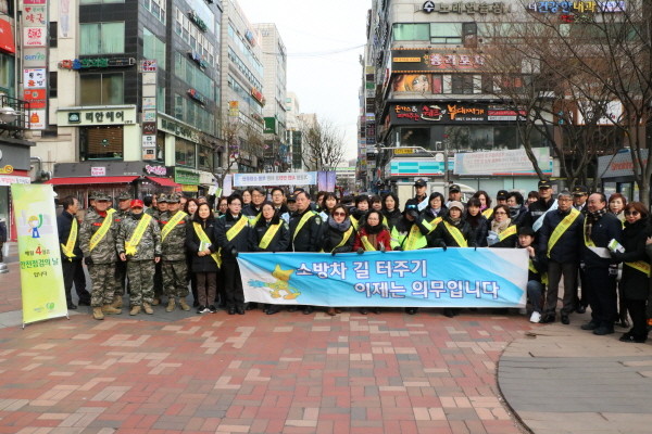 경기 군포소방서와 군포시는 지난 4일 ‘안전점검의 날’을 맞아 산본중심상가 로데오거리에서 합동 캠페인을 실시했다. 사진은 참여자들이 소방차 길터주기 캠페인을 펼치는 모습.(사진제공=군포소방서)