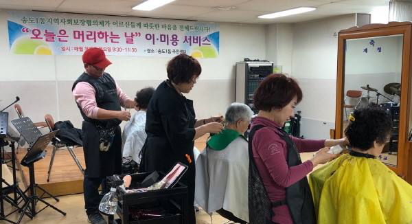 인천 연수구 송도1동 지역사회보장협의체는 지난 4일 지역내 노인들을 대상으로 ‘오늘은 머리하는 날’ 무료 이·미용서비스 사업을 실시했다. 사진은 참여자들이 노인의 머리를 손질하는 모습.(사진제공=연수구청)