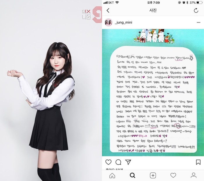 또한 "짧다고 하면 짧고, 길다고 하면 길었던 몇 달동안 '믹스나인' 촬영을 하면서 정말 행복했고, 또 재미있었고, 즐거웠습니다. 속상해서 울던 날도 있었지만 울고 웃었기에 더 많고 반짝거리는 추억을 만들 수 있었던 것 같아요"라고 '믹스나인' 출연 당시를 회상했다.
