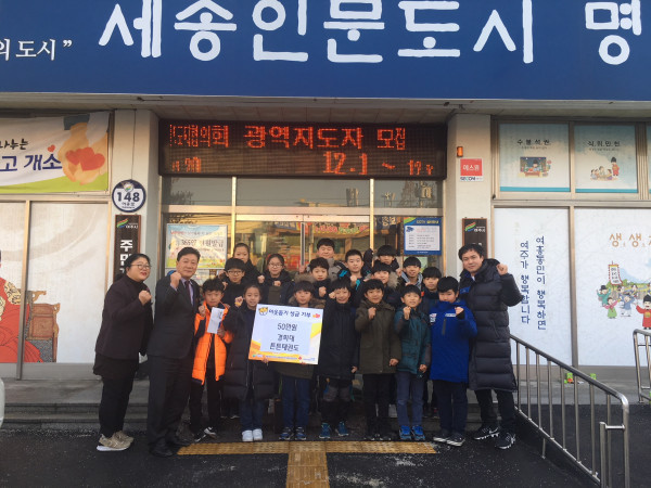 경기 여주시 여흥동 소재 경희대 튼튼태권도는 지난 5일 국회의장배 태권도 대회에서 우승상금으로 받은 50만원을 지역내 어려운 이웃을 위해 사용해달라며 여흥동에 기탁했다. 사진은 기탁식에 참여한 원생 등 관계자들이 기념촬영을 하는 모습. (사진제공=여주시청)