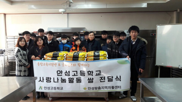 경기 안성고등학교가 지난 5일 학교에서 박한식 교장을 비롯한 본교 교직원과 학생 등이 참석한 가운데 지역내 저소득 취약계층을 위해 마련한 쌀 24포(10kg)를 안성맞춤지역자활센터에 기탁했다. 사진은 기탁식에 참석한 관계자들이 쌀 기탁에 앞서 기념촬영을 하는 모습. (사진제공=안성시청)