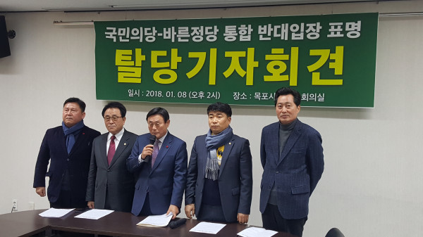 [목포=황승순 기자] 국민의당 소속 목포시의원 5명이 국민의 당을 탈당했다. 지난 8일 시의회 1층에 마련된 시민의 방에서 국민의당 탈당파 이기정 의원을 비롯한 5명은 "김대중 전 대통령 정신계승에부합하지 않을 뿐만 아니라 햇볓정책을 전면부정하는 보수대야합이라"며 탈당을 선언했다.