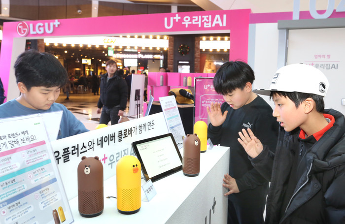 | ▲ 최근 여의도 IFC몰에서 진행한 ‘유플러스 우리집AI 방탈출 게임 이벤트’ 현장에서 아이들이 유플러스 우리집AI를 체험해보는 모습.(사진제공=LG유플러스) | ||