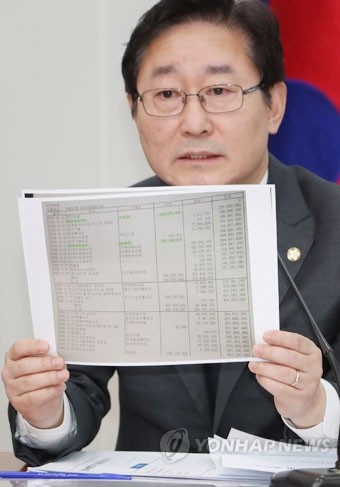더불어민주당 박범계 적폐청산위원장이 10일 국회에서 열린 최고위원회의에서 이명박 전 대통령이 실소유주라는 의혹이 일고 있는 자동차 부품회사 다스와 관련, 이 전 대통령의 친형인 이상은 대표가 증여세를 포탈한 정황이 있다고 주장하며 관련 서류복사본을 들어보이고 있다.