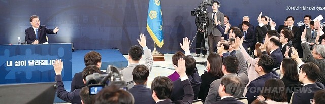 문재인 대통령이 10일 오전 청와대 영빈관에서 열린 신년 기자회견에서 질문하기 위해 손을 든 기자 중에서 질문자를 지명하고 있다. 이날 기자회견은 사전에 질문과 질문자를 정하지 않고 대통령이 직접 질문자를 지명하는 방식으로 진행됐다.