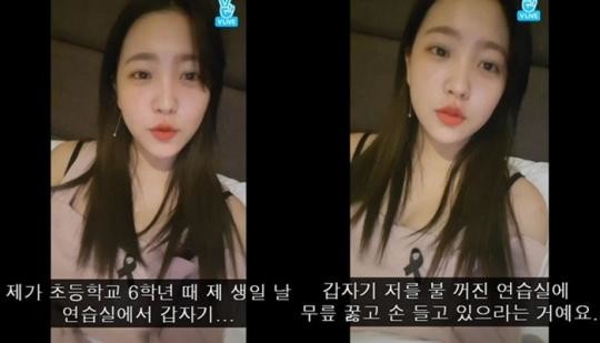 예리는 “생일날이고 선배님들도 다 있었는데 갑자기 저한테 불 꺼진 연습실에 무릎 꿇고 손들고 있으라고 했다”며 이야기를 시작했다.