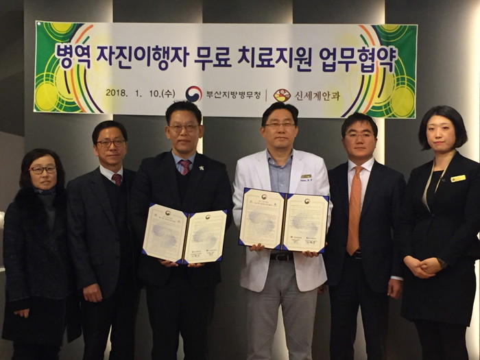 [부산=최성일 기자]부산지방병무청(청장 김용무)은 지난10일 부산지역 신세계안과(대표원장 허준)와 병역 자진이행 희망자를 위한 무료 치료(시력교정술) 서비스 제공을 위하여 업무협약을 체결했다고 밝혔다.