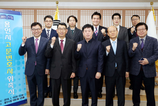 경기 용인시는 10일 시청 시민홀에서 법률자문과 소송사건의 원활한 수행을 위한 고문변호사로 변호사 3명을 재위촉하고, 6명을 신규 위촉했다. 사진은 고문변호사 등 관계자들이 위촉식 후 기념촬영을 하는 모습. (사진제공=용인시청)