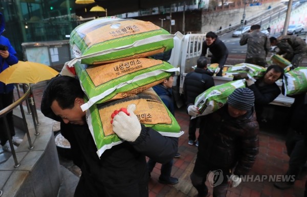 11일 오전 서울 성북구 월곡2동 주민센터에서 주민들이 이름을 밝히지 않은 기부자가 기부한 쌀 300포대를 옮기고 있다. 얼굴 없는 성북구 기부천사는 8년 동안 매년 쌀 300포대씩 총 1억2천여만원 상당의 쌀을 기부했다.