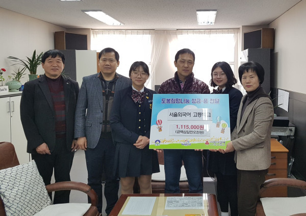 최근 서울 도봉구 창4동 소재 서울외국어고등학교는 학생들이 정성껏 마련한 ‘따뜻한 겨울나기 성금’ 111만5000원을 창4동 주민센터에 기탁했다. 사진은 기탁식 후 서울외고 학생 등 관계자들이 기념촬영을 하는 모습. (사진제공=도봉구청)
