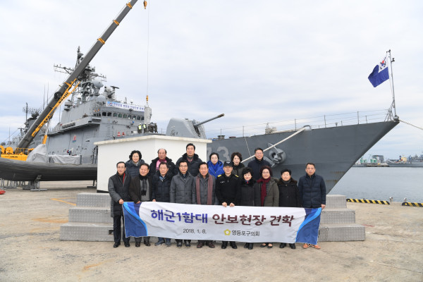 | ▲ 서울 영등포구의원들이 해군 제1함대사령부를 방문, 해군 구축함인 ‘양만춘함’ 앞에서 기념촬영을 하고 있다. (사진제공=영등포구의회) | ||