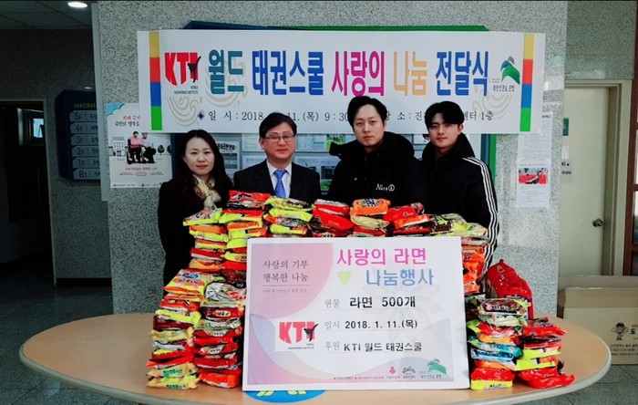 서울 은평구 진관동 주민센터에서는 최근 KTI 월드 태권스쿨의 '사랑의 라면 전달식'을 개최해 소외된 이웃에게 라면 500개를 전달했다. 사진은 관계자들이 기념촬영을 하는 모습. (사진제공=은평구청)