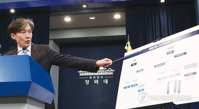 조국 청와대 민정수석이 14일 오후 춘추관 대브리핑실에서 현 정부의 국정원, 검찰, 경찰 등 권력기관 개혁 방안을 발표 하고 있다.