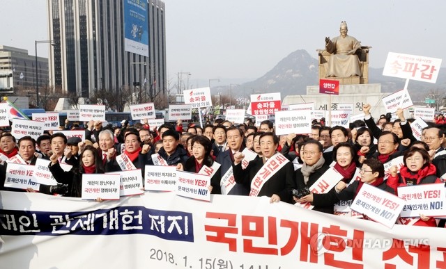 자유한국당 김성태 원내대표와 소속 의원들이 15일 오후 서울 광화문 세종 동상 앞에서 ‘문재인 관제개헌 저지 국민개헌 선포’ 기자회견을 하고 있다.
