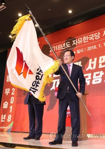 자유한국당 홍준표 대표가 16일 오전 서울 마포구 케이터틀에서 열린 서울시당 신년인사회에서 당기를 흔들고 있다.