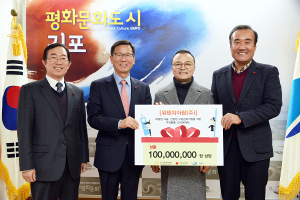 최근 경기 김포시에 위치한 (주)위덴치아랑은 지역내 어려운 이웃을 위해 사용해 달라며 칫솔세트 등의 구강용품 8700세트(1억원 상당)를 김포복지재단에 기탁했다. 사진은 기탁식에 참여한 시청 및 위덴치아랑 관계자들이 기념촬영을 하는 모습. (사진제공=김포시청)