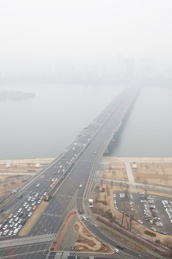 초 미세먼지 주의보가 발효중인 18일 오전 서울 마포대교 일대의 하늘이 미세먼지로 인해 뿌옇게 보이고 있다.