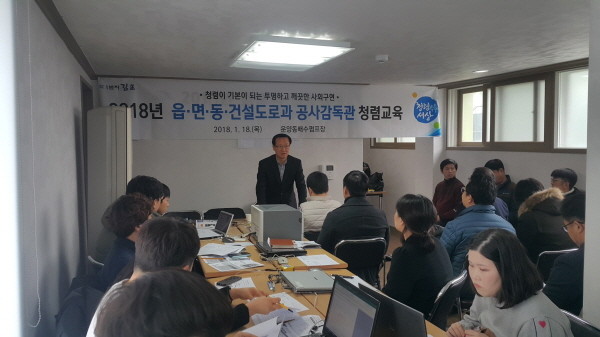 지난 18일 경기 김포시는 올해 건설사업 합동설계 작업에 참여하는 읍·면·동 실무자를 대상으로 건설공사의 계약심사 실무 교육과 공사감독 분야에 대한 청렴교육을 실시했다. 사진은 교육이 진행 중인 모습.(사진제공=김포시청)