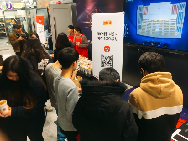 | ▲ bbq 올리버스 경기장에서 치킨을 나누어 주고 있다 | ||