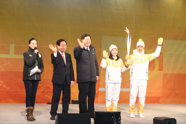 서울 영등포구의회 의원들은 최근 여의도한강공원 민속놀이마당에서 열린 ‘2018평창동계올림픽 성화봉송 축하행사’에 참석했다. 사진은 성화봉송행사에 참여한 배우 최수종·하희라씨와 구청장과 구의장 등 관계자들이 성화대에 올라 인사를 하고 있는 모습. (사진제공=영등포구의회)