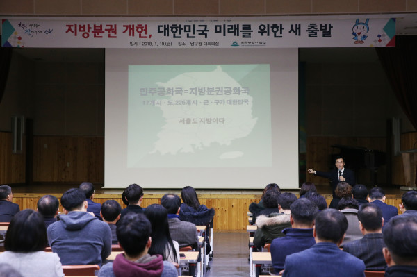 인천 남구는 지난 19일 구청 대회의실에서 전직원을 대상으로 지방분권 강연회를 개최했다. 사진은 김중석 지방분권개헌국민회의 공동대표가 ‘지방분권 개헌, 대한민국의 미래를 여는 새출발’이라는 주제로 강연을 진행하는 모습. (사진제공=남구청)