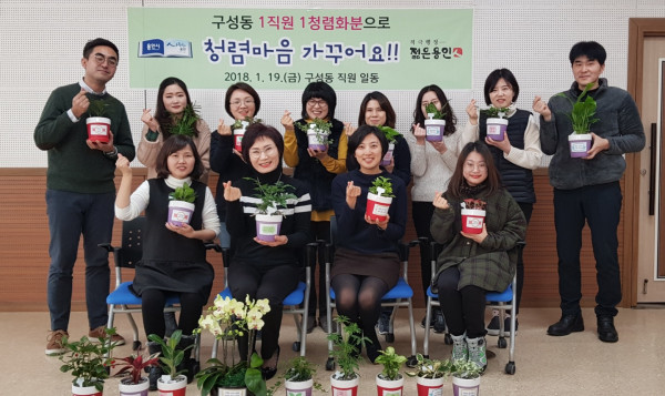 경기 용인시 기흥구 구성동은 지난 19일 공직자의 청렴의식을 다지기 위해 전직원에게 청렴표어를 부착한 ‘청렴화분’을 나눠줬다. 사진은 구성동 관계자들이 화분을 들고 기념촬영을 하는 모습. (사진제공=용인시청)