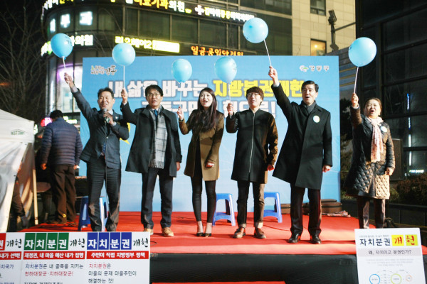 강동구가 최근 이마트 천호점 앞 광장에서 기초자치단체로서는 전국 최초로 ‘자치분권 개헌을 위한 버스킹’을 개최했다. 사진은 지방분권 개헌을 외치는 버스커들 모습. (사진제공=강동구청)