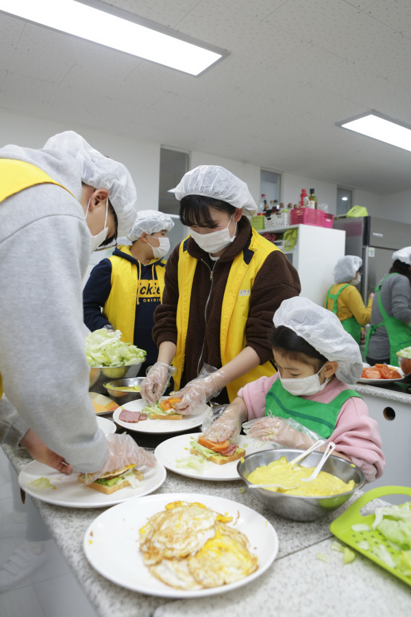 금천구는 지난 19일 오후 4시 금천경찰서에서 구 청소년과 다문화 아동이 손수 만든 샌드위치를 경찰관들에게 전달하는 행사를 가졌다. 사진은 청소년과 다문화 아동이 샌드위치를 열심히 만들고 있는 모습. (사진제공=금천구청)
