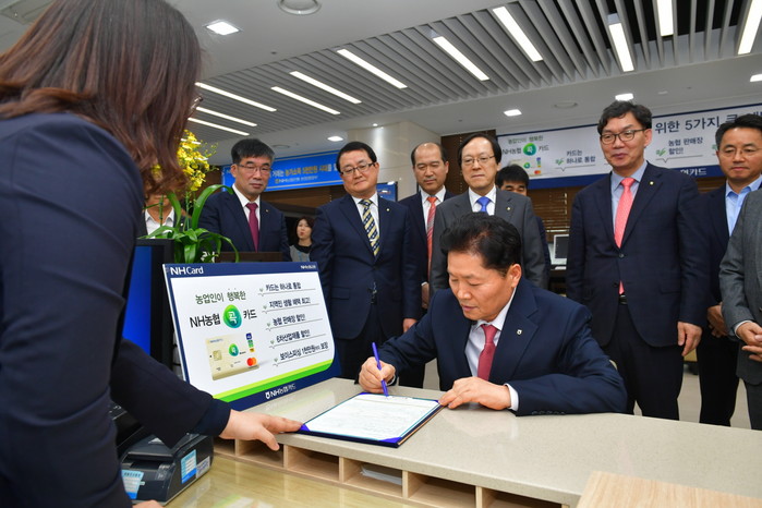 | ▲ 김병원 농협중앙회장이 NH농협 콕카드 1호 가입신청서를 작성 중인 모습.(사진제공=농협중앙회) | ||