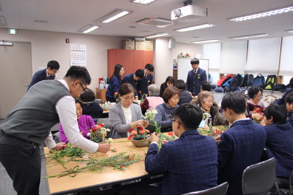 이날 행사에서 학생들은 지난 1년간 평생교육 프로그램으로 연마한 꽃꽂이 기술로 추운겨울 노인들에게 자연의 아름다움을 손으로 만지며 심리적 안정과 마음의 치유를 선물했다.