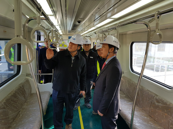 장영근 경기 김포부시장은 지역내 최대 현안사업인 도시철도 ‘김포골드라인’ 공사와 관련해 김포한강차량기지 종합관제실과 차량 검수고 등을 방문해 현장점검을 실시했다. 사진은 전동차에 탑승해 내부구조를 살펴보고 있는 장 부시장 등 관계자들의 모습. (사진제공=김포시청)