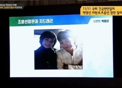 그러자 박 의원은 조 전 장관을 향해 "그렇게 관심이 많아서 정유라와 사진 찍고 지난해 12월 빅뱅과 사진 찍었냐"며 지드래곤과 함께 찍은 사진을 화면에 공개했다.