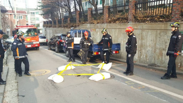지난 20일 오후 3시27분경 서울 동작구 사당로 10길 72(사당동) 이면도로상 지름 30cm, 깊이 50cm가량의 도로침하현상이 발생해 동작소방서 대원들이 출동했다. 사진은 소방대원들이 파이어라인을 사용해 사고지점 주위를 차단하는 모습. (사진제공=동작소방서)