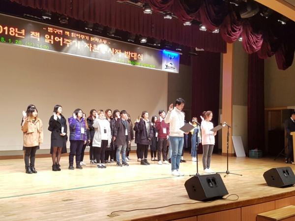 인천 연수구립도서관은 지난 20일 구청 연수아트홀에서 '2018년도 책 읽어주기 자원봉사자 발대식'을 개최했다. 사진은 봉사자들이 선서를 하고 있는 모습. (사진제공=연수구청)