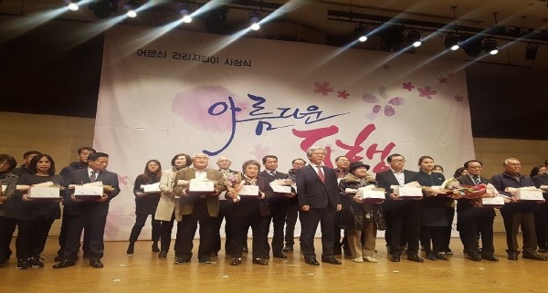 | ▲ 구는 '이웃사촌 건강경로당' 사업으로 국민건강보험공단 주관 '아름다운 동행' 노인 건강지킴이에서 노인들의 노년기 생활운동 실천분야 공로를 인정받아 감사장을 받았다. | ||