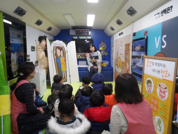 경기 오산시는 지난 18일 어린이집 어린이를 대상으로 지난해 금연 홍보·교육 등을 위해 제작한 ‘건강으로 가는 금연버스’의 2018년 첫 운행을 시작하고, 교육을 진행했다. 사진은 교육에 참여한 어린이집 원생들이 금연 교육을 받고 있는 모습. (사진제공=오산시청)
