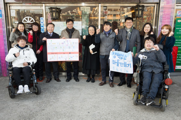 서울 은평구가 최근 ‘장벽없는 마을 만들기 사업’의 일환으로 ‘장벽없는 마을상점 마크 인증식’을 개최했다. ‘장벽없는 마을 만들기 사업’은 장애인들이 불편을 겪지 않는 공간을 조성하는 사업이다. 사진은 인증식에 참여한 관계자들이 파이팅을 외치는 모습. (사진제공=은평구청)