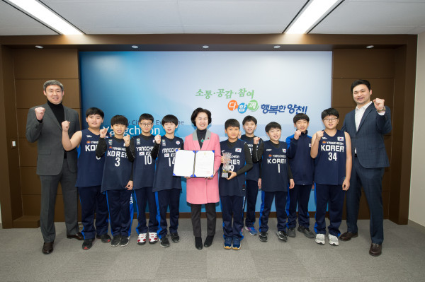 양천구의 유소년 저학년부(3~4학년) 농구 꿈나무 8명이 최근 강원도 홍천에서 열린 ‘2018년 전국 종별 생활체육 농구대잔치’에서 준우승을 차지했다. 사진은 준우승 수상을 기념해 구청장과 어린이들이 기념촬영하는 모습. (사진제공=양천구청)