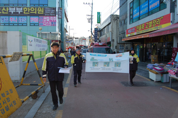 경기 오산소방서는 24일 10시 오산시 일대 및 오색시장에서 ‘1월중 유관기관 합동 소방차 길 터주기 훈련’을 실시했다. 사진은 소방서 관계자들이 캠페인을 진행 중인 모습. (사진제공=오산소방서)