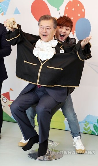 문재인 대통령이 24일 오전 보육정책과 관련한 현장 방문으로 서울 도봉구 한그루 어린이집에서 아이들과 마술공연을 관람하던 중 마술사 최현우씨의 제안으로 마술보조를 해주고 있다.