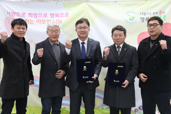 최근 경기 평택복지재단 산하 팽성노인복지관과 사단법인 '서귀포를 사랑하는 사람들의 모임'은 팽성노인복지관에서 지역사회 소외된 이웃을 위한 나눔활동을 위해 업무협약을 체결했다. 사진은 협약 체결 후 기념촬영을 하고 있는 관계자들의 모습. (사진제공=평택시청)
